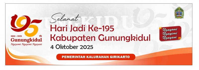Pemerintah Kalurahan Girikarto mengucapkan selamat memperingati hari jadi Kabupaten Gunungkidul yang ke-195 (4 Oktober 2025). Semoga di usia yang semakin matang ini, Gunungkidul terus bersinar seperti cahaya kemuliaan yang terang, menginspirasi kita semua untuk menjaga harmoni, melestarikan kearifan lokal, dan mewujudkan kehidupan yang adil dan makmur bagi seluruh masyarakat