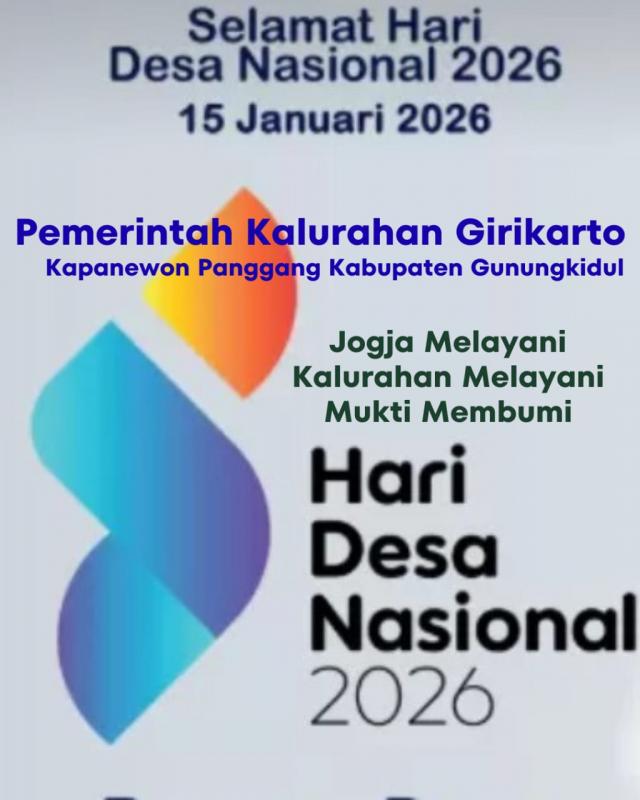 Pemerintah Kalurahan Girikarto mengucapkan Selamat Hari Desa Nasional Tahun 2026. Hari Desa Nasional Tahun 2026 diperingati pada tanggal 15 Januari 2026. untuk memperingati hari desa nasional Pemerintah Kalurahan Girikarto melaksanakan Apel bersama antara pamong dan lembaga-lembaga kalurahan yang ada di Girikarto. Apel dilaksanakan di joglo Kalurahan Girikarto dikarenakan cuaca sedang hujan.