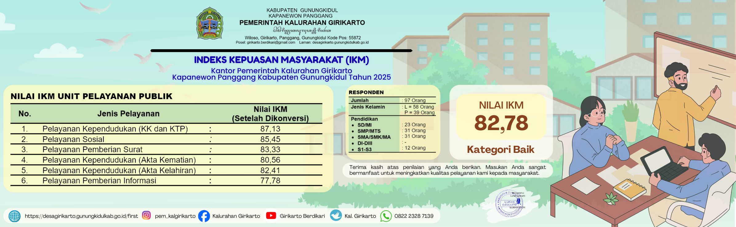 Pemerintah kalurahan Girikarto telah melaksanakan Survey kepuasan masyarakat terhadap pelayanan yang ada di Kalurahan Girikarto. pada semester II tahun 2025 didapatkan sebanyak 97 responden dalam survey yang dilaksanakan. dari 97 responden tersebut terdiri dari 58 laki-laki dan 39 perempuan. ada berbagai macam jenis pelayanan yang diminta diantaranya pelayanan capil, pemberian surat, pelayanan sosial dan pemberian informasi. nilai IKM pada semester II tahun 2025 yaitu 82,78 dan masuk kategori Baik.