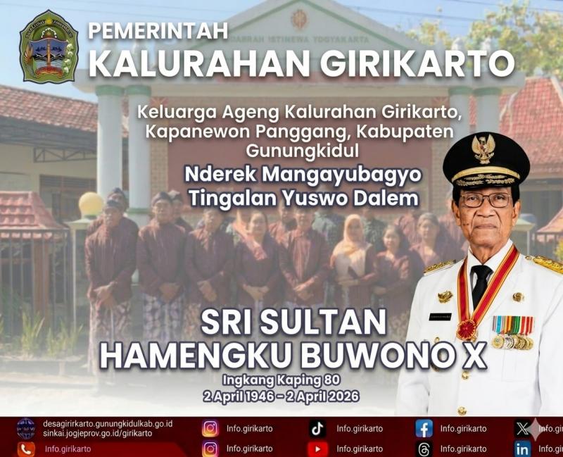 Kamis 2 April 2026 Pemerintah Kalurahan Girikarto mengikuti kirab di Alun Alun Yogyakarta dalam rangka hari ulang tahun Ngerso Dalem Sri Sultan Hamengkubuwana X ke 80 (Gubernur DIY)