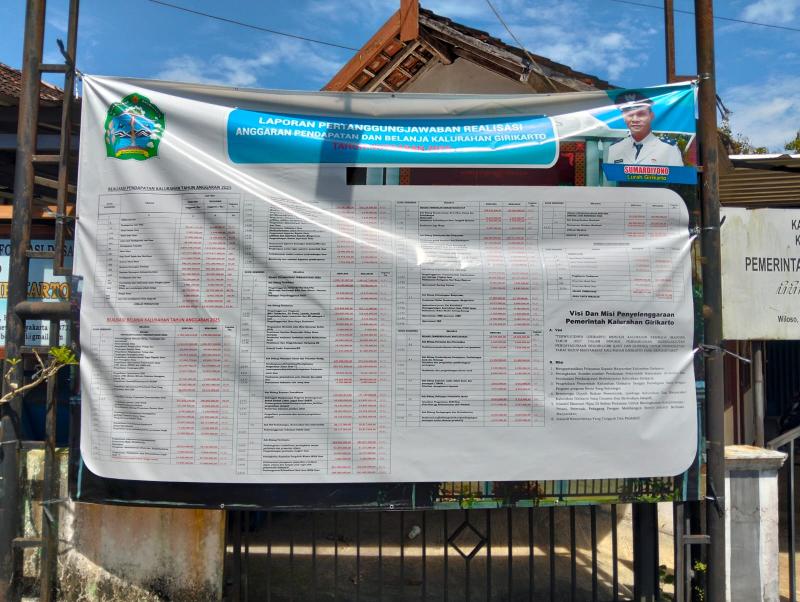 Laporan pertanggungjawaban APBKal Kalurahan Girikarto Tahun Anggaran 2025 telah di pasang di papan Baliho Kalurahan Girikarto.